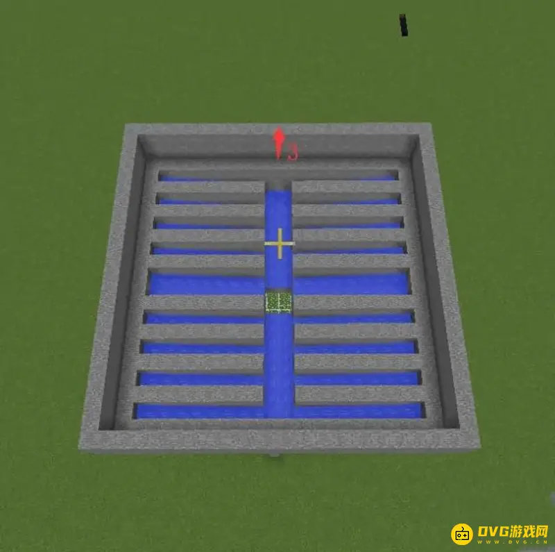 12、在第三格高的地方,用石头顺时针方向填满。在塔通道的一边开始向周围建造,长度8格就可以了。一格一格水的最大流动距离就是8格