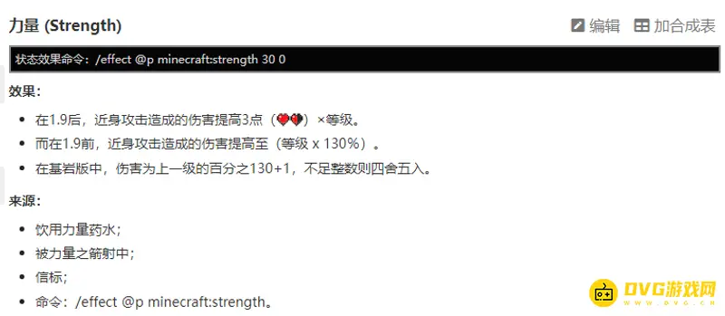 命令:/effect @p minecraft:strength。永久力量效果指令为/effect @a strength 99999 250,效果:在1.9后,近身攻击造成的伤害提高3点()×等级。而在1.9前,近身攻击造成的伤害提高至(等级 x 130%)。在基岩版中,伤害为上一级的百分之130 1,不足整数则四舍五入。来源:饮用力量药水;被力量之箭射中。