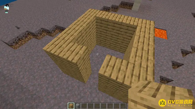 1,首先我们可以用任意方块把房子四周给围起来,前面留两格用来放门。