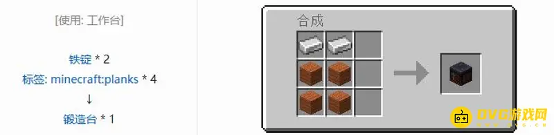 3,最后我们使用工作台,在上面放上两个铁锭,下面放任意四块木板就可以合成锻造台了,锻造台是我的世界中一种生成在村庄中的工具匠工作站点方块,可以用来制作下界合金质工具、武器和盔甲。
