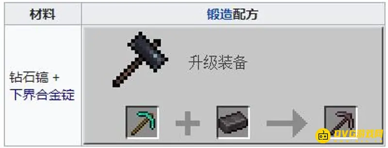 在我的世界游戏中,下界合金镐可通过在锻造台中升级钻石镐来获得,如下图所示,玩家使用【钻石镐】和【下界合金锭】即可锻造出下界合金镐。