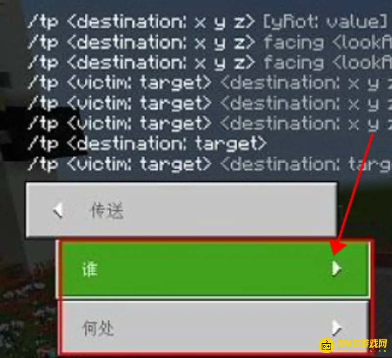 4、接下来需要选择传送“谁”至“何处”,这里的两个选项都是指的玩家,比如传送玩家A至玩家B这样的形式。