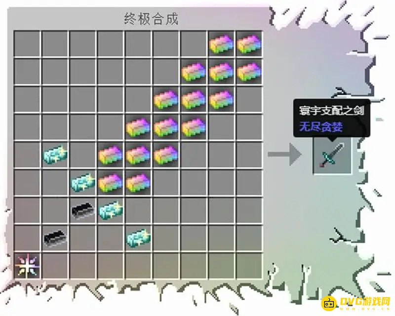 2、寰宇支配之剑的制作材料为16个无尽之锭、4个水晶矩阵锭、2个中子锭和1个无尽催化剂,将材料在终极工作台上摆放处剑的形状后就可以合成为寰宇支配之剑这件装备了。