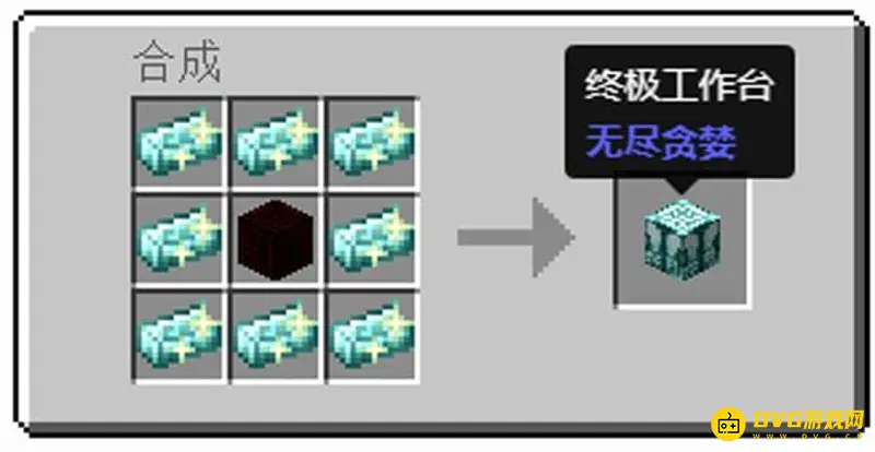 1、制作寰宇支配之剑需要使用到终极工作台这个道具,使用1个二重压缩工作台和8个水晶矩阵锭就能制作获得