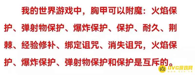 我的世界游戏中,胸甲可以附魔:火焰保护、弹射物保护、爆炸保护、保护、耐久、荆棘、经验修补、绑定诅咒、消失诅咒,火焰保护、爆炸保护等,弹射物保护和保护是互斥的。