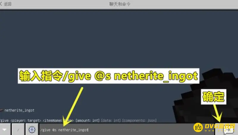 在指令输入界面输入英文指令/give @snetherite_ingot,然后点击确认,这样就可以获得下界合金了。