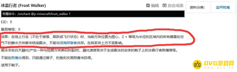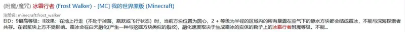 作用为在地上行走,2 等级为半径的区域内的所有暴露在空气下的静水方块都会结成霜冰。