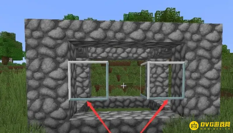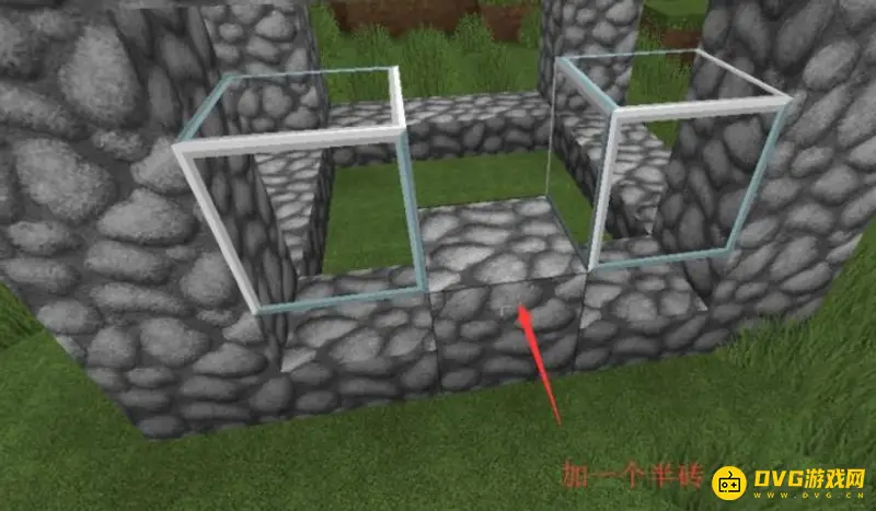 3、然后我们就可以在上下两层半砖之间修筑防御墙了。防御墙两侧采用玻璃方块(透明的,方便我们观察外面的敌情)。