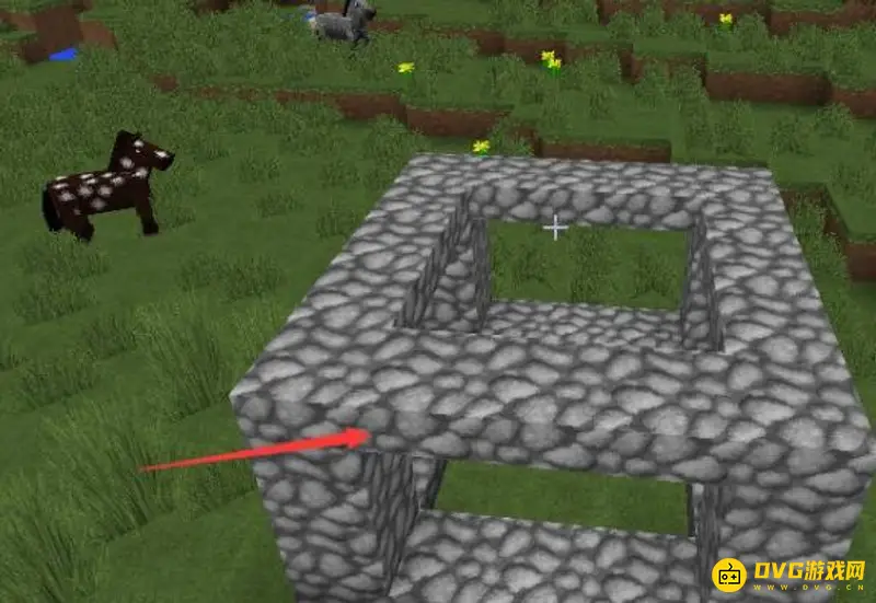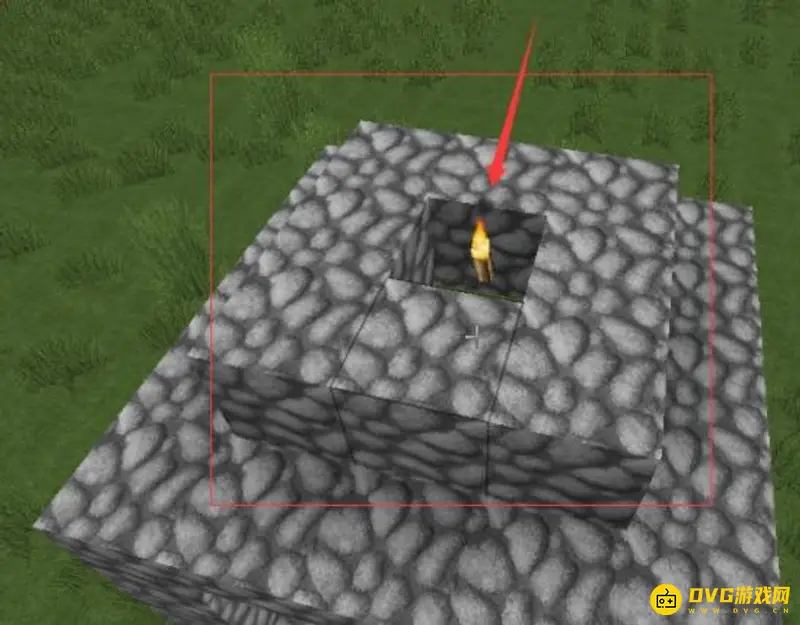 6、现在我们已经做好了碉堡主体,下面就做一个盖顶,防止蜘蛛入侵。盖顶很简单,在上面围上一圈圆石即可,中间留一个洞插一根火把用于照明。