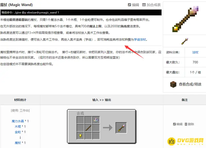 在我的世界中,巫术学MOD里面的魔杖是个比较基础的武器。当熟练度达到满值时,便可放入奥术工作台,再放入奥术宝典(学徒),即可消耗宝典将法杖升级为学徒法杖。