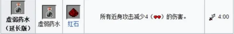 10.虚弱药水延长版=发酵蛛眼 水 红石(4:00)使用效果时间延长至4分钟
