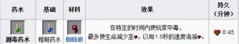 9.剧毒药水=粗制药水 蜘蛛眼(1:30)(特定的时间内使玩家中毒,以每2秒减半颗心的速度,直到剩半颗心将不再减)