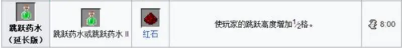 14.跳跃药水延长版=粗制药水 兔子脚 红石粉(8:00)使用有效时间延长至8分钟