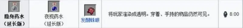 11.隐身药水延长版=粗制药水 金萝卜 发酵蛛眼 红石粉(8:00)使用有效时间延长至8分钟