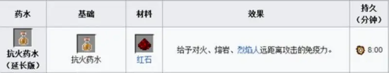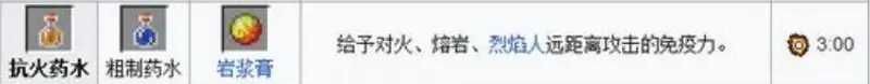 2.抗火药水=粗制药水 岩浆膏(3:00)有效时间内对火、熔岩、烈焰人火球等免疫伤害