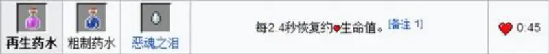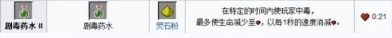18.剧毒药水Ⅱ=粗制药水 蜘蛛眼 萤石粉(0:21)(特定的时间内使玩家中毒,以每1秒减半颗心的速度,直到剩半颗心将不再减)
