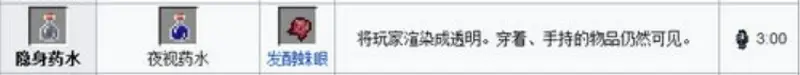 10.隐身药水=粗制药水 金萝卜 发酵蛛眼(3:00)将玩家变成透明,但是穿着和手持物仍然可以看见
