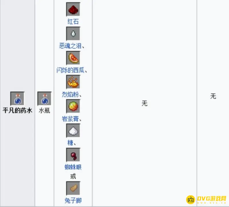 2.平凡的药水=(烈焰粉、蜘蛛眼、岩浆膏、恶魂之泪、糖、兔子脚、闪烁的西瓜)任选一个 水瓶(制作药水的基础,直接喝无任何作用)