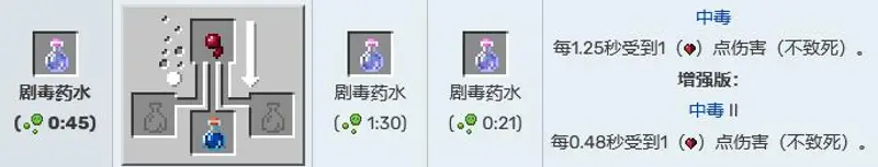 1,剧毒药水,作用为每1.25秒或0.48秒受到1点伤害,但不致死。