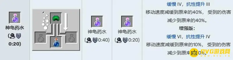 神龟药水,作用为移动速度减缓到原来的40%或者10%, 受到的伤害减少到原来的40%或者20%。
