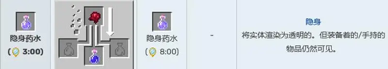 7,隐身药水,作用为将实体渲染为透明的。但装备着的/手持的物品仍然可见。
