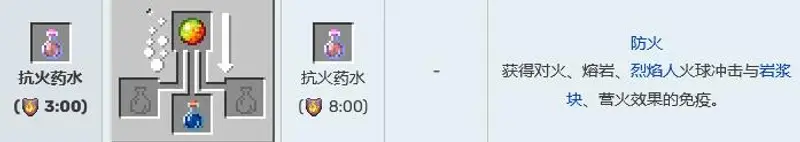 2,抗火药水,作用为获得对火、熔岩、烈焰人火球冲击与岩浆块、营火效果的免疫。