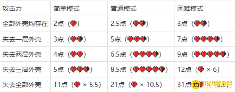 1、钢铁史莱姆总共有四层外壳,每使用镐类工具挖掉一层体积就会变小一圈,外壳需要快速连续用镐类工具点击进行挖掘,如果挖掘过程中断会快速回复当前层的外壳。当全部外壳被挖掘掉后方可攻击本体,本体拥有35点生命值。钢铁史莱姆的攻击力会随着外壳层数减少而增加。具体数据参考下图。