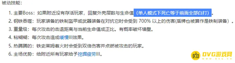 2、这个boss目前打不了,外壳用镐子没有效果,点燃也无法点燃,无敌的,常规手法无法打出伤害。在钢铁史莱姆失去全部外壳时伤害较高,单下攻击对无抗性提升的全套保护IV下界合金护甲玩家依旧能造成5点伤害,并且由于攻击判定问题可能会使玩家在短时间内受到2-3次伤害,而玩家此时因处于高额的缓慢效果下导致难以规避伤害。此外由于钢铁史莱姆的被动效果,原版盾牌在附魔耐久III情况下在此时依旧只能抵挡5-6次攻击。被动技能如下图。