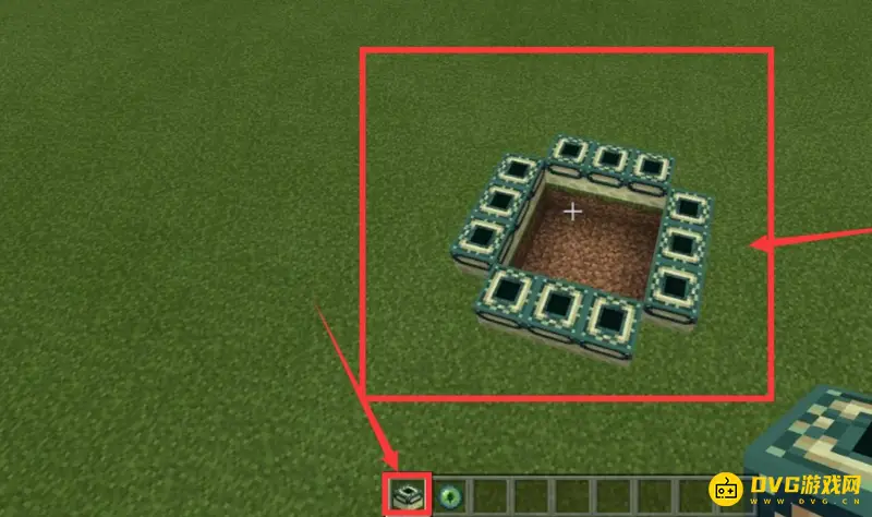1、在地上挖一个3x3正方形的坑,站在坑的中间,向周围摆放末影地传送门。
