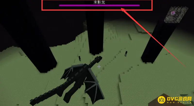 4、站在坑的中间摆放完末影之眼,之后会直接传送到末影地,来到末影地即可看到末影龙在空中盘旋,游戏上方会有末影龙的血条。