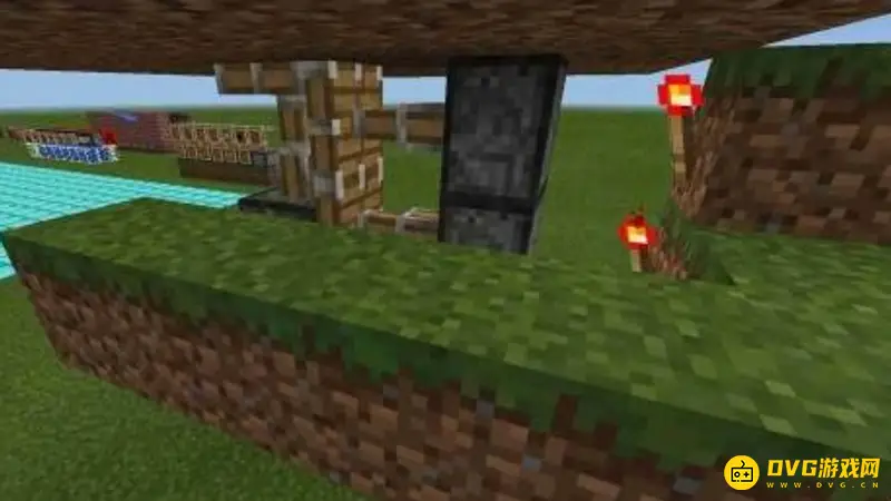 2.在活塞旁放置红石火把,并在距离粘性活塞一格的地方放置两个粘性活塞,并在这两个活塞后也放上红石火把。