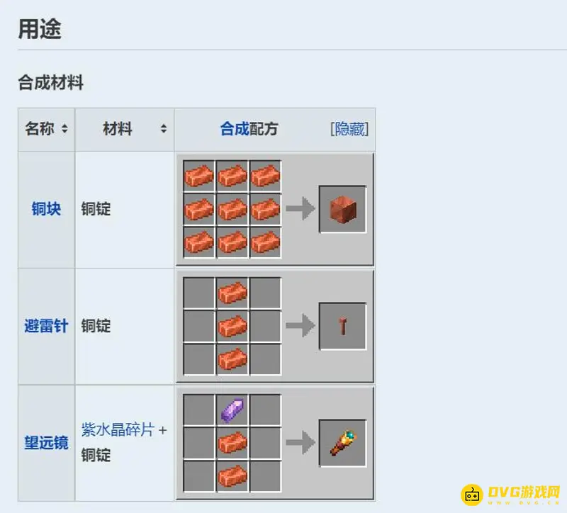 在我的世界这款游戏里,铜锭的用途有三种:用九个铜锭合成一个铜块;用三个铜锭合成一个避雷针;用两个铜锭和一个紫水晶碎片合成一个望远镜。