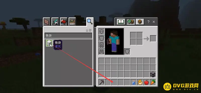 1、在我的世界中,将背包中的铁块拖到物品栏中,如下图所示。