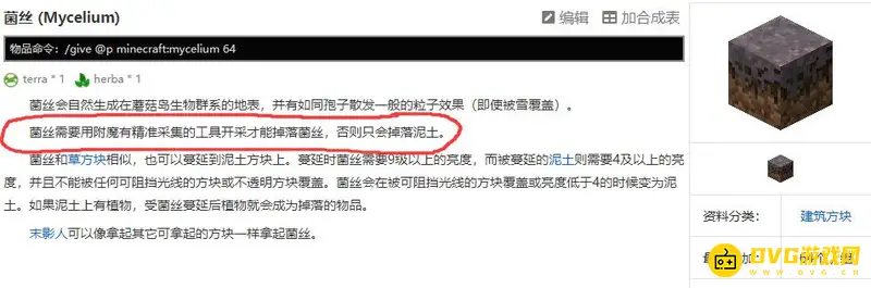 2,然后就可以在界面上方发现,需要用附魔有精准采集的工具开采才能获得菌丝土。