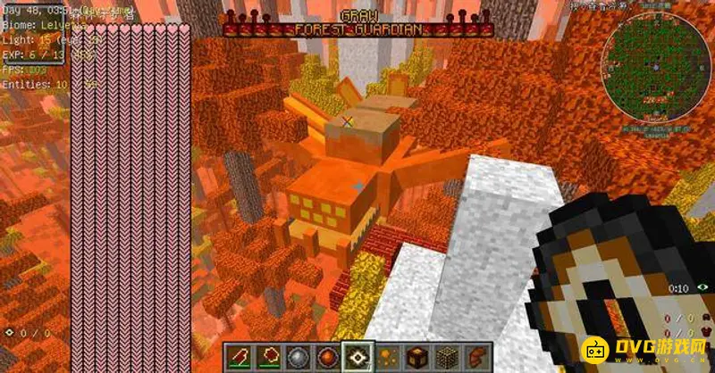 6、森林守护者、通关召唤物守护者之眼到守护者祭坛召唤。通过击杀赫尔维蒂世界的生物掉落黄色或者橙色孢子,然后寻找到森林守护者之柱,用任意孢子右键其顶部的祭坛会生成一个发光的弗莱,击杀该弗莱会掉落boss召唤物守护者之眼。
