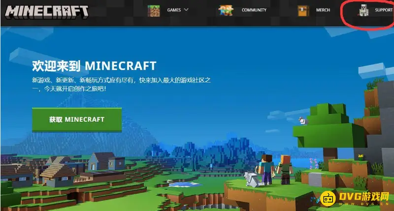 1.首先进入我的世界游戏的官网,点击右上角SUPPORT查看相关说明。