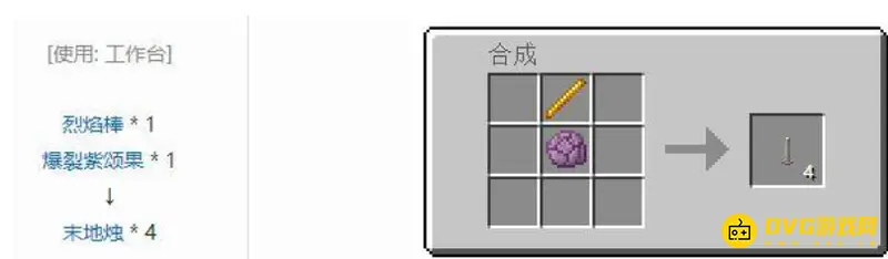 2.然后找到末地烛的相关说明,就可以发现合成方法了,需要烈焰棒和爆裂紫颂果进行合成就可以得到。