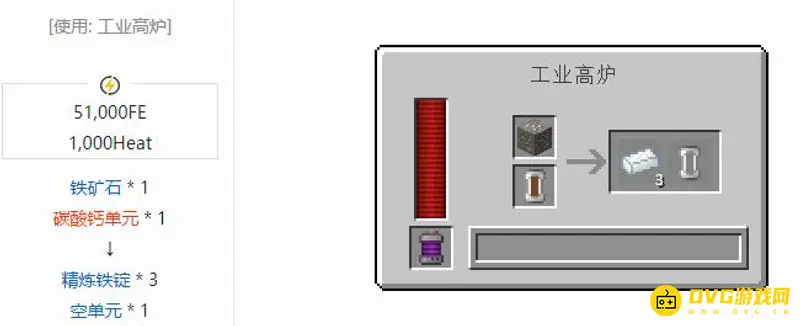 4,最后一个方法如下,为使用工业高炉,铁矿石和碳酸钙单元熔炼成精炼铁锭。