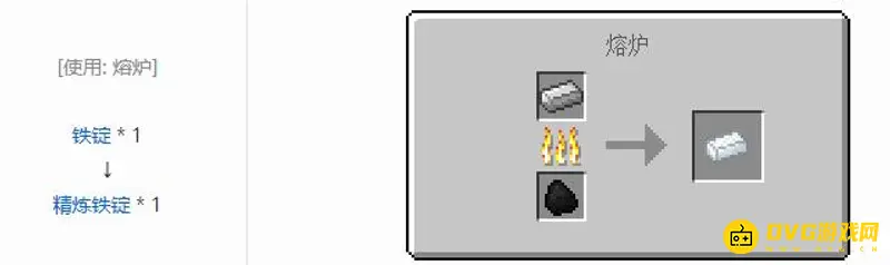 3,第三个方法如下,为用熔炉再一次熔炼铁锭,就可以变成精炼铁锭了。