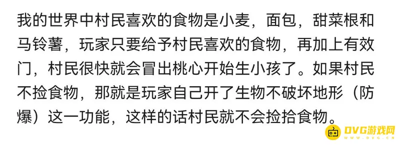 吃的是小麦、面包、甜菜根和马铃薯,玩家只要给予村民喜欢的食物,除此之外,再加上有效门,村民就能够很快冒出红心,然后生小孩子了。