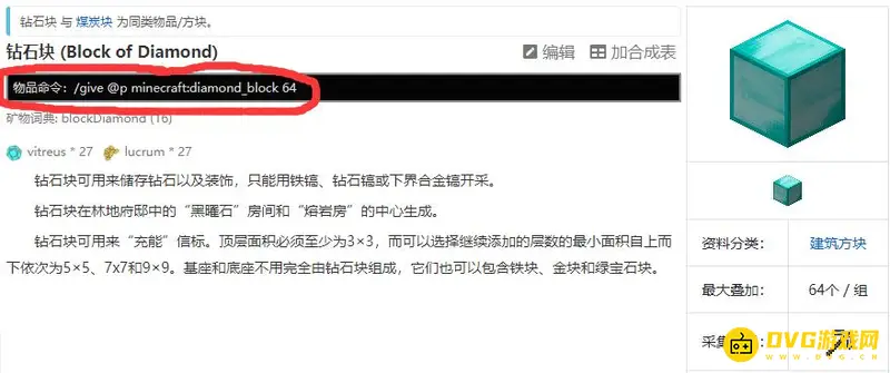2,然后找到钻石块的相关说明,就可以发现钻石块的命令了。