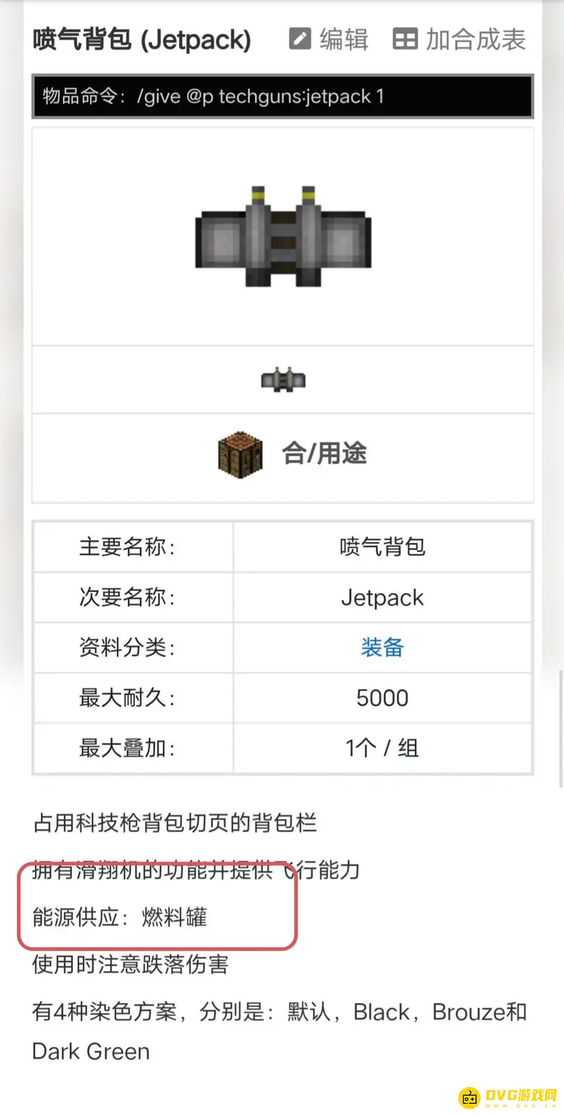 把燃料罐放在下面即可实现充能。 :按住空格键时不断上升,速度逐渐变快,约1s到达最高速。装备在身上可飞行的背包,深受玩家的喜爱。