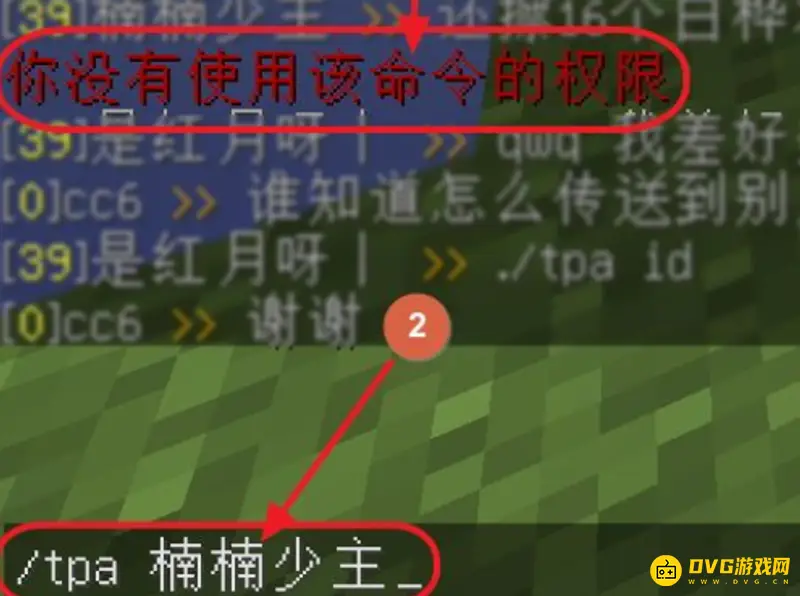 4.一般服务器如果没有打开指令保护的话我们就可以传送到队友那里了。如果提示没有使用该命令的权限时,我们在聊天框中输入/tpa 好友ID然后按回车键。