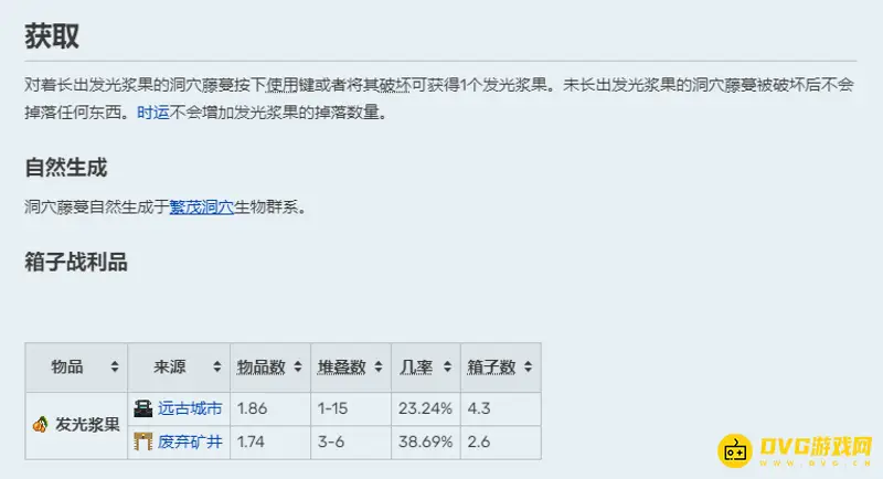 游戏里的发光浆果可通过对着洞穴藤蔓按下使用键或者将其破坏获得或者废弃矿井的奖励箱中有几率藏有发光浆果。当洞穴藤蔓长出发光浆果时,会发出等级为14的光。