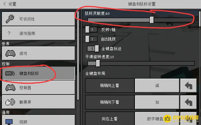 2,然后点击左侧的键盘和鼠标,右侧灵敏度调成60即可。