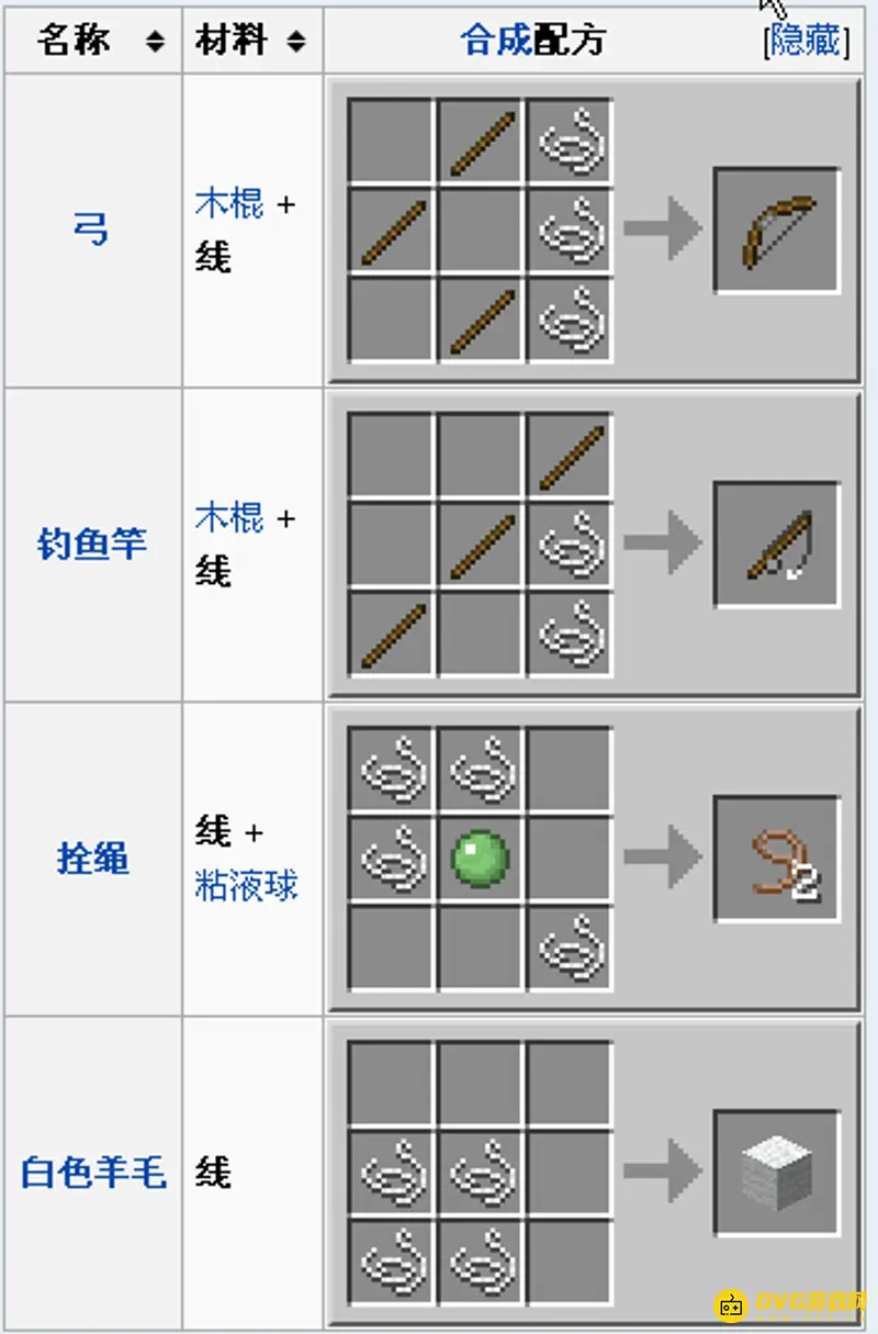 2、作为合成材料,线是弓和钓鱼竿的重要材料。线亦可以用来制作羊毛,不过这个做法很浪费,因为羊毛可以从羊身上取得。把线储起来制作更多鱼竿(有耐久值及会破损)和弓(可用来造发射器)比较符合经济原则。