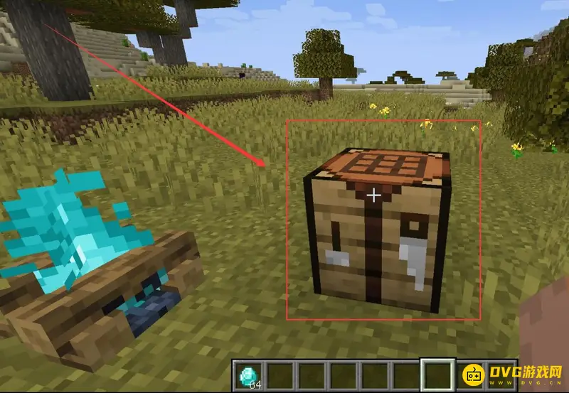 2、进入游戏后,我们首先找到工作台,将鼠标准星对准后右键点击打开合成界面。