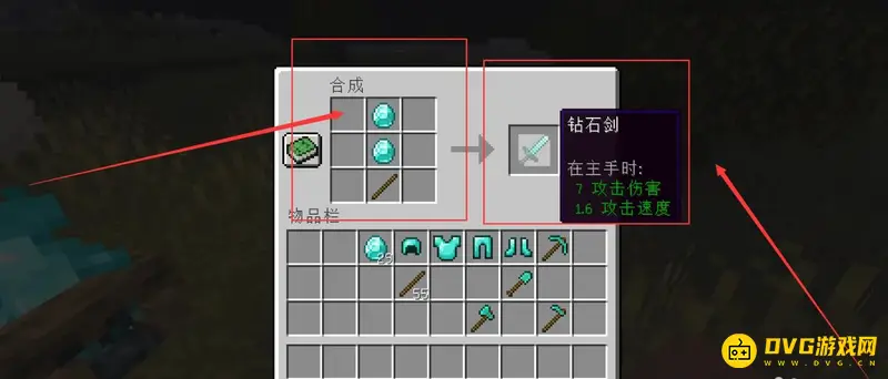 3、我们按照图示合成配方进行合成,利用二个钻石和一个木棍就可以合成钻石剑了。