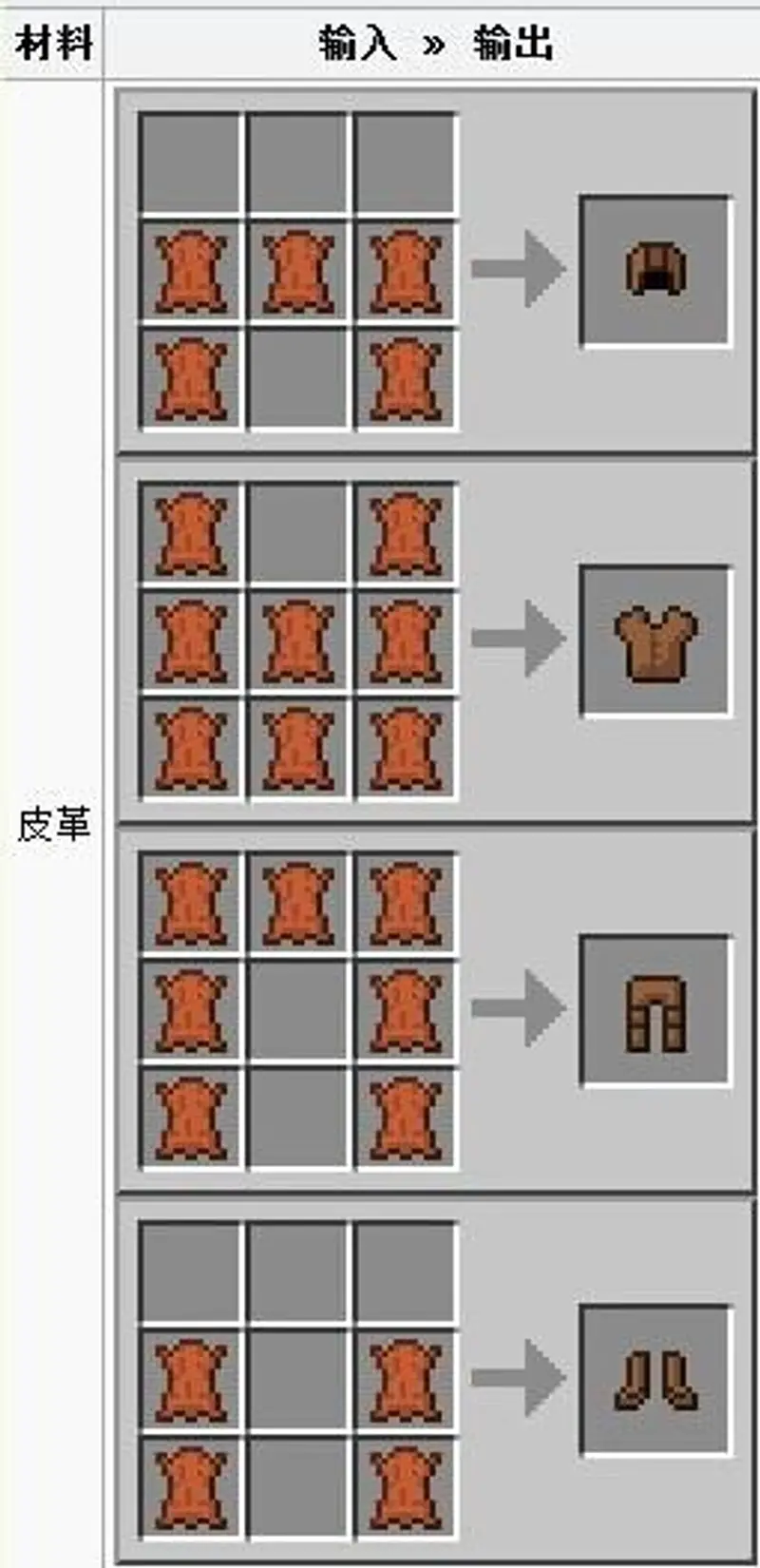皮革可以物品展示框和书以及制作皮革盔甲,杀死牛的时候有机会掉下0-2块皮革。皮革是用来制作最低阶的盔甲,一套完整的皮革盔甲需要24块皮革。