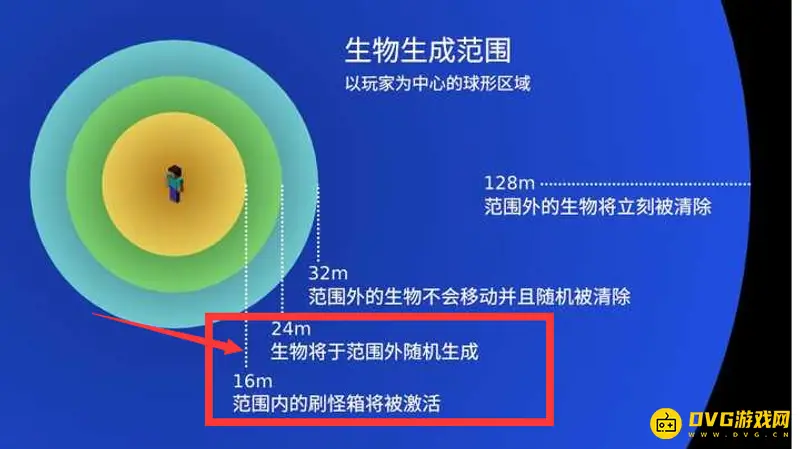 距离玩家16格到48格之间,符合刷怪规则的实体方块上随机刷怪。不会再玩家周围16格内刷怪,超过48格的区块没有加载,也不会刷怪。具体数据如下图所示:
